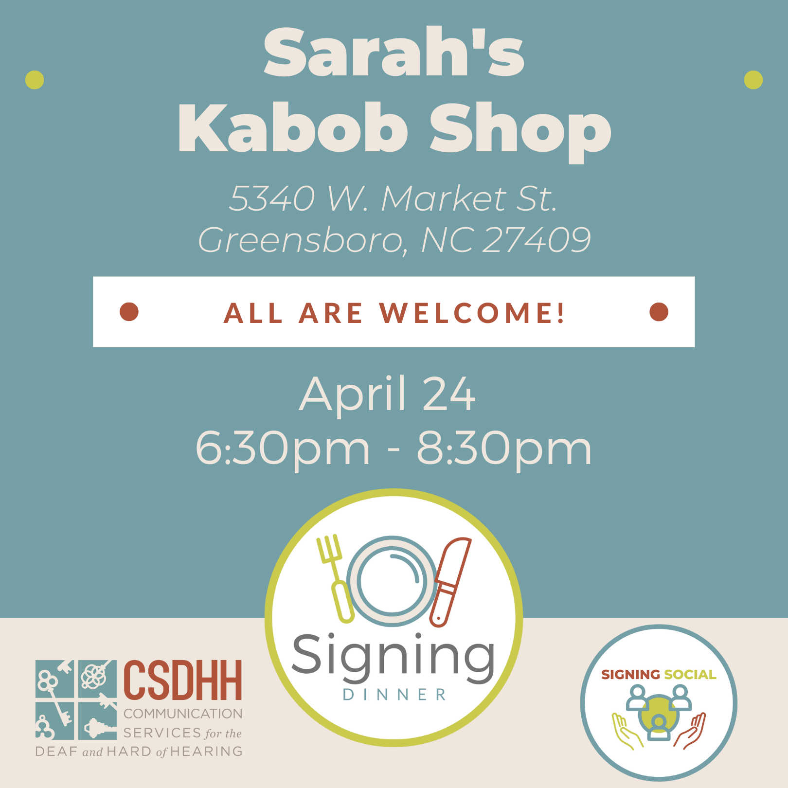 Our April Signing Dinner will be at Sarah’s Kabob Shop, on W. Market St., on April 24 at 6:30pm.