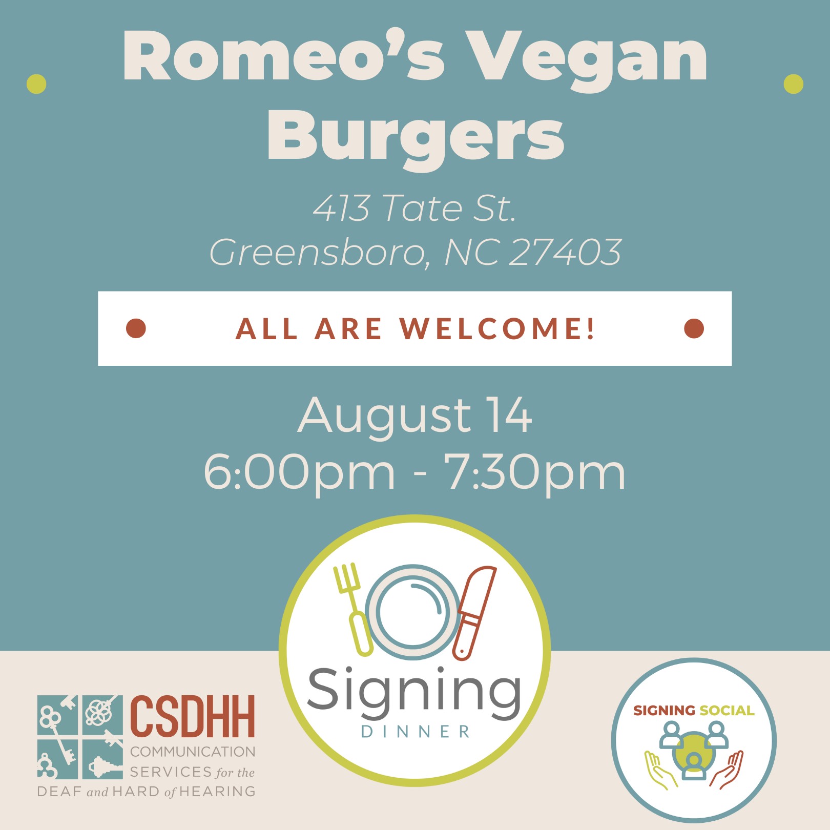 Our August Signing Dinner will be at Romeo’s Vegan Burgers on Tate St. on August 14 at 6:00pm.