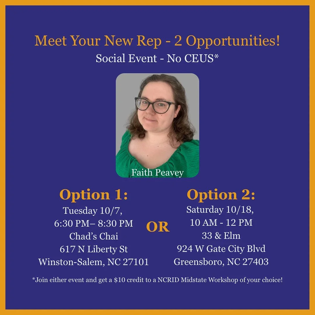 Come meet the new NCRID Mid-State Regional Representative (who represents our area on the statewide board), and share your thoughts on what workshops, events, and activities you want to see! Plus, attendees will get a $10 credit for a Mid-State NCRID Workshop of your choice!