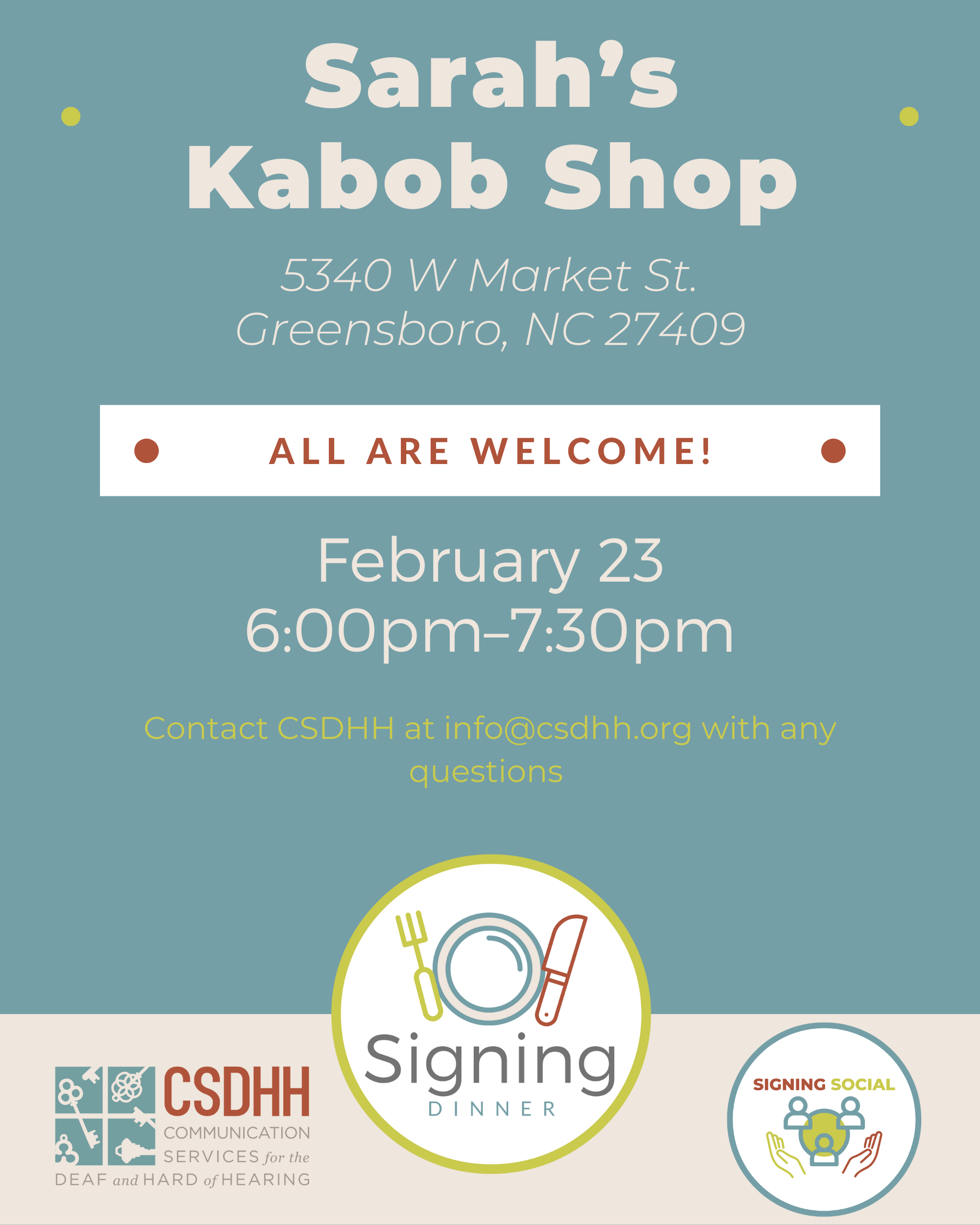 Our February Signing Dinner will be at Sarah’s Kabob Shop on W Market St., on February 23 at 6:00pm.
