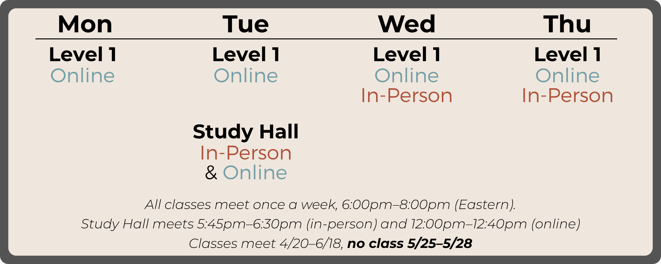 We’ll share more information on the first night of class, but each week we offer optional review sessions called Study Halls for any extra practice, review, or questions students have. We’re here to support you however we can!