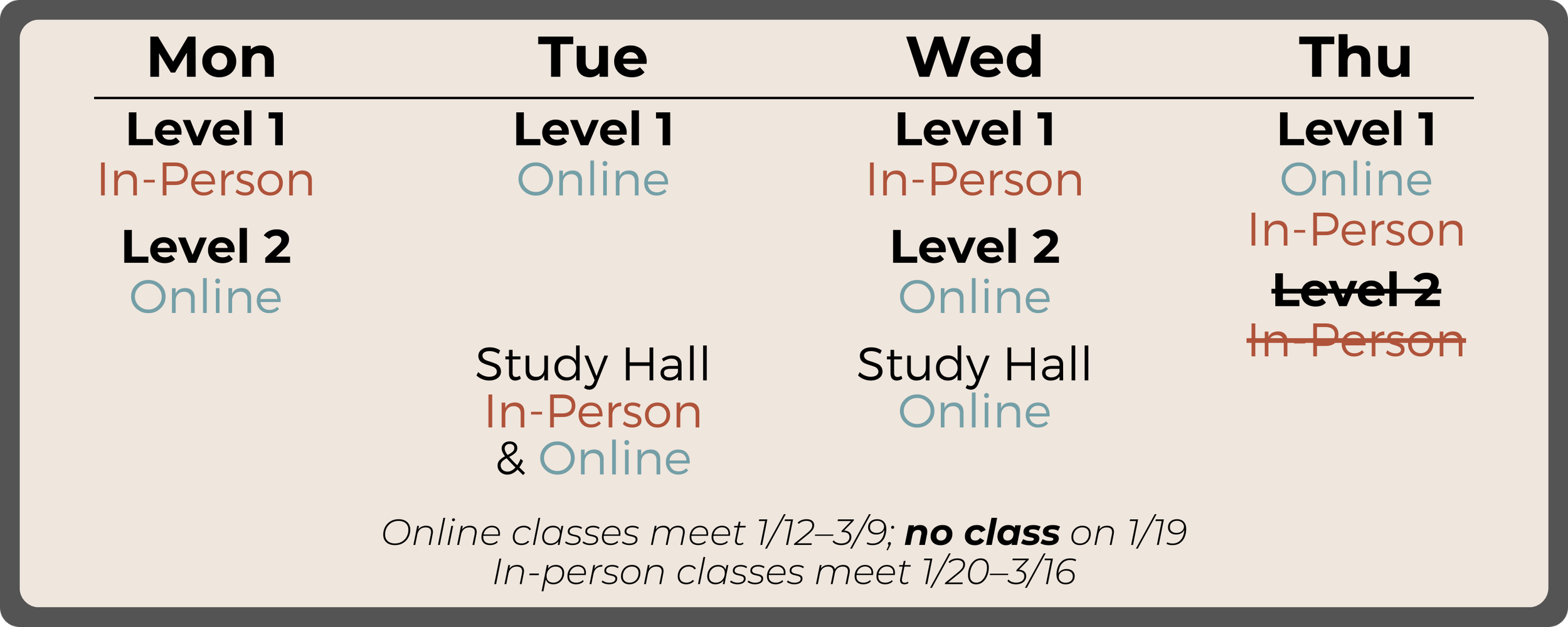 All of our classes meet once a week from 6:00pm–8:00pm (Eastern) for eight weeks. Winter 2026 classes meet from January 12 through March 16, 2026.