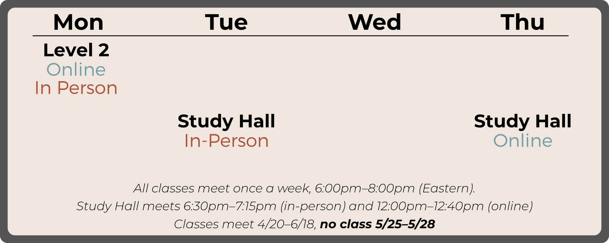 During the spring session, we’ll offer Study Hall for in-person students on Tuesdays 6:30pm–7:15pm, and for online students on Thursdays 12:00pm–12:40pm.