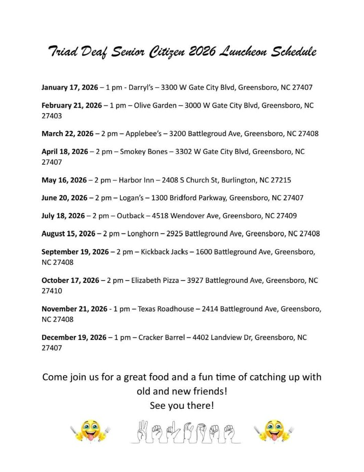 Triad Deaf Senior Citizens will host a Luncheon on 12/19 at 1:00pm at Cracker Barrel on Lawndale Dr.