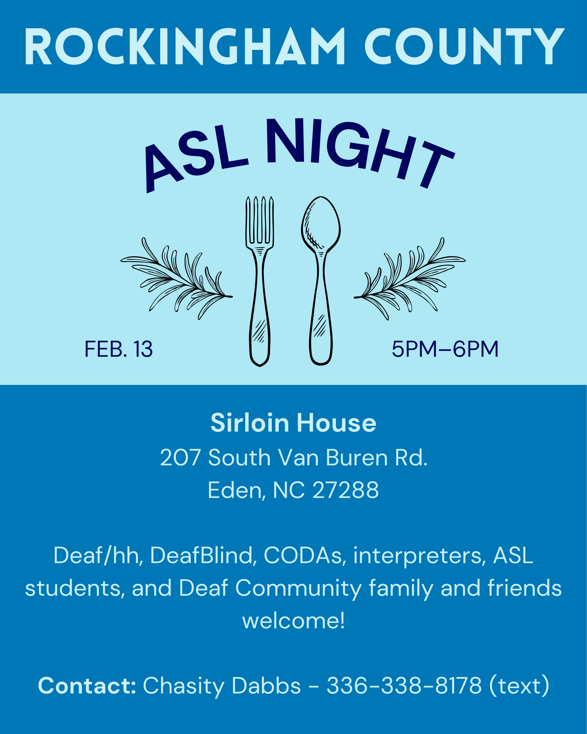 Rockingham County will have an ASL Night at Sirloin House in Eden, February 13, at 5pm.