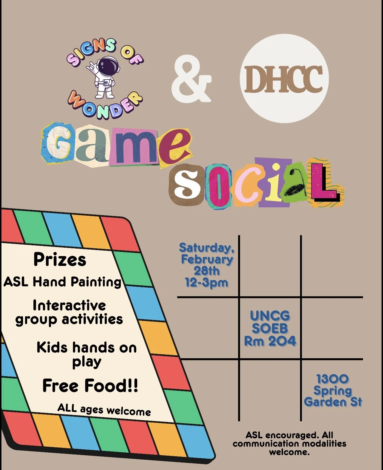 They will host a Game Social on Saturday, February 28 from 12pm–3pm, at UNCG SOEB Room 204. They will have prizes, ASL hand painting, interactive group activities, kids’ hands-on play, and free food! All ages are welcome. ASL is encouraged; all communication modalities welcome. Contact DHCC with any questions.