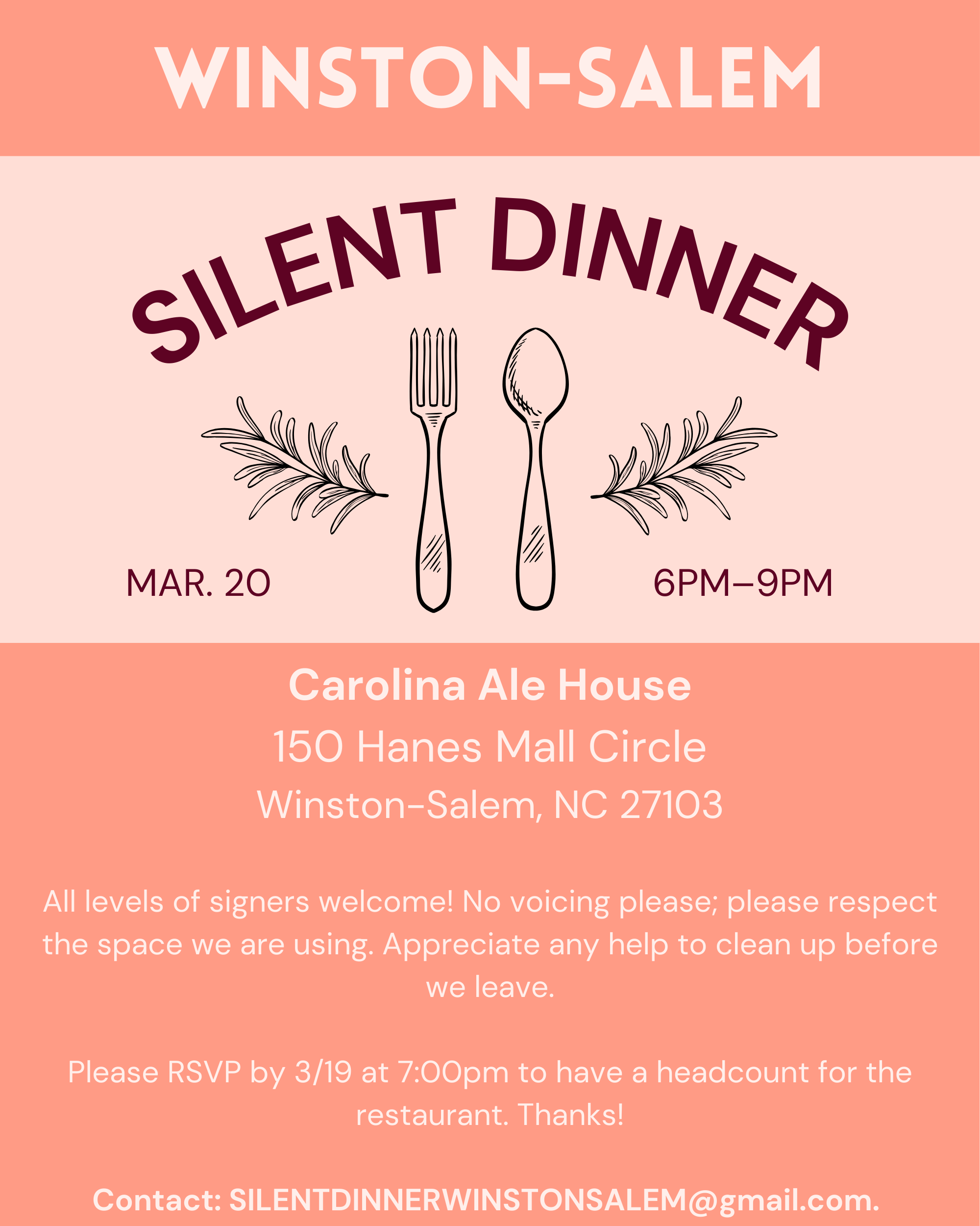 Winston-Salem will have a Silent Dinner at Carolina Ale House, March 20, 6pm–9pm.