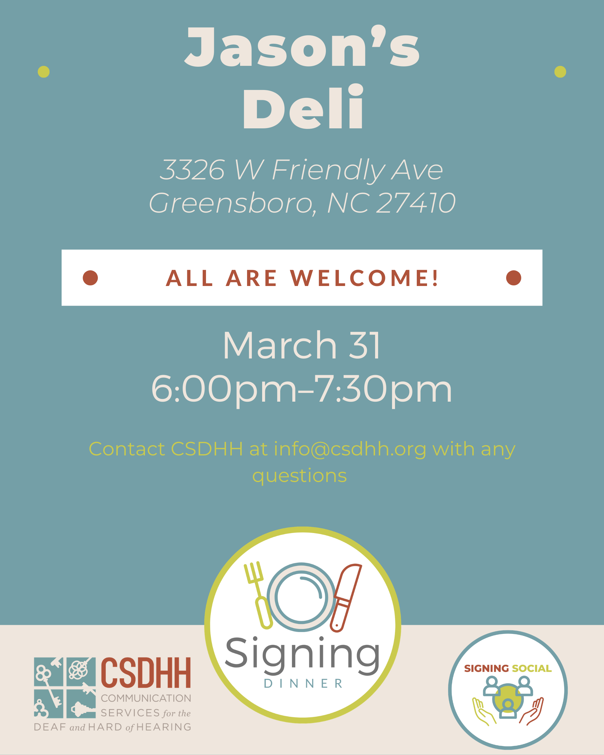 Our March Signing Dinner will be at Jason’s Deli in Friendly Center, on March 31 at 6:00pm.