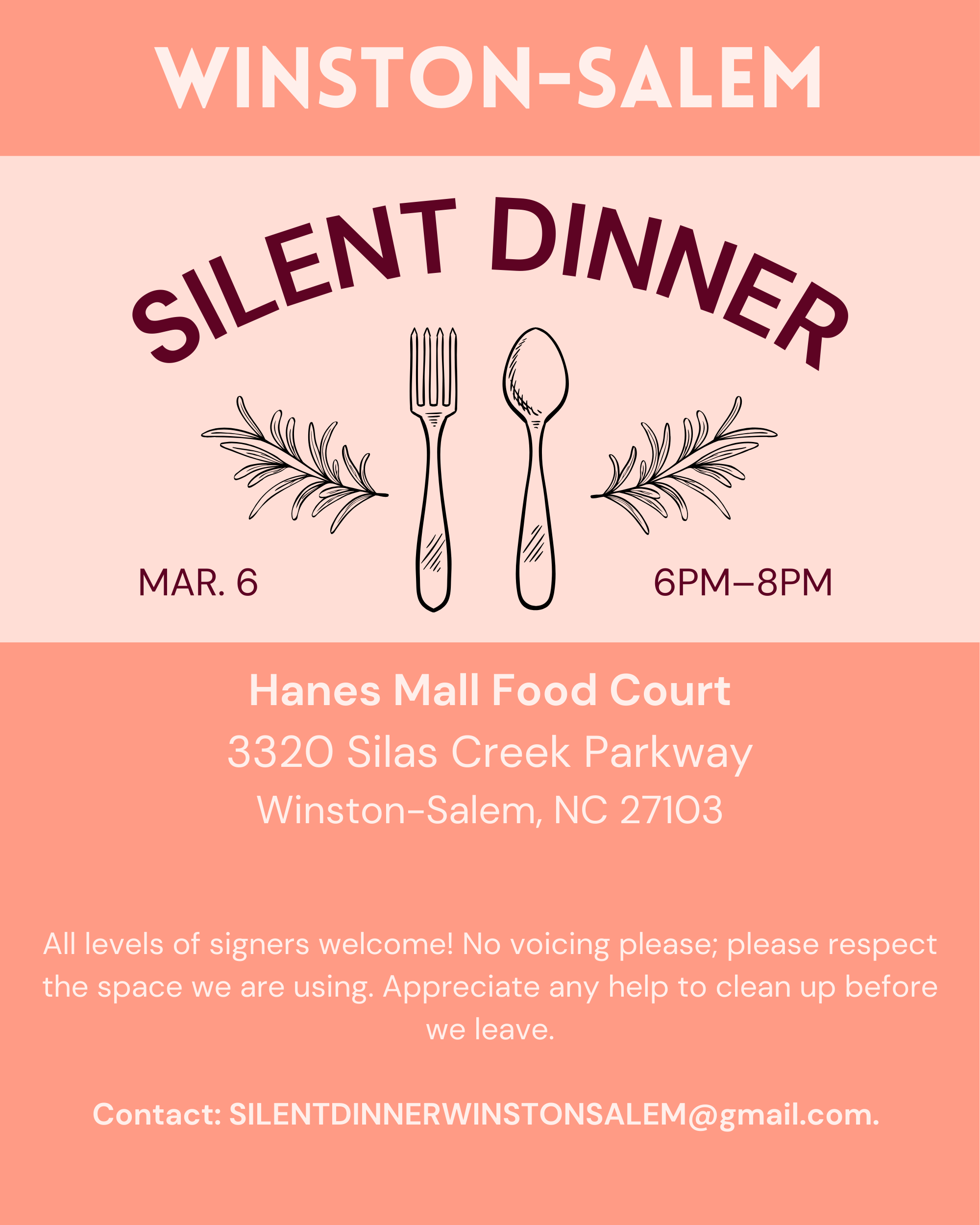 Winston-Salem will have a Silent Dinner at the Hanes Mall Food Court, March 6, 6pm–8pm.