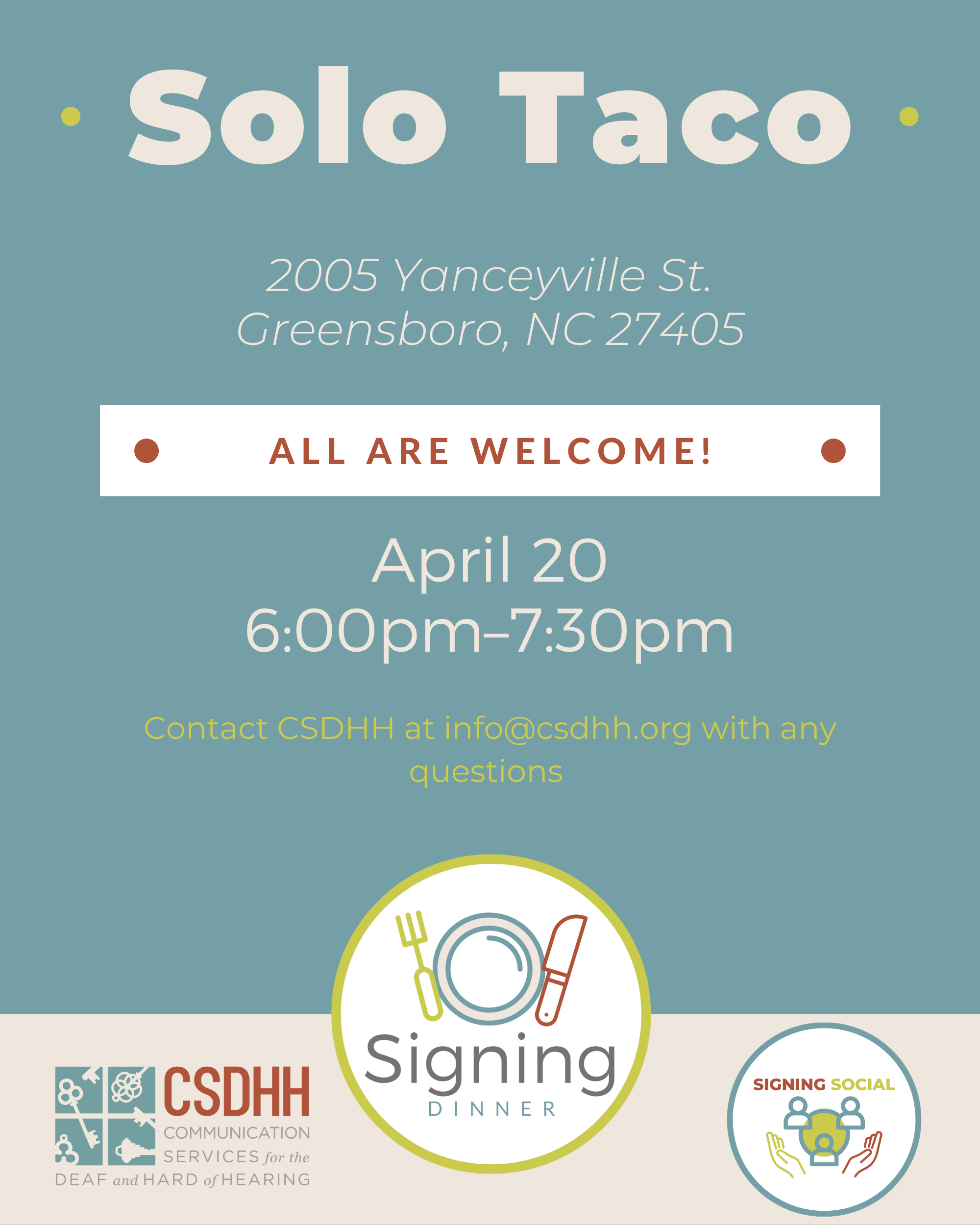 Our April Signing Dinner will be at Solo Taco on Yanceyville St. (on the lower level just below our office!), on April 20 at 6:00pm.