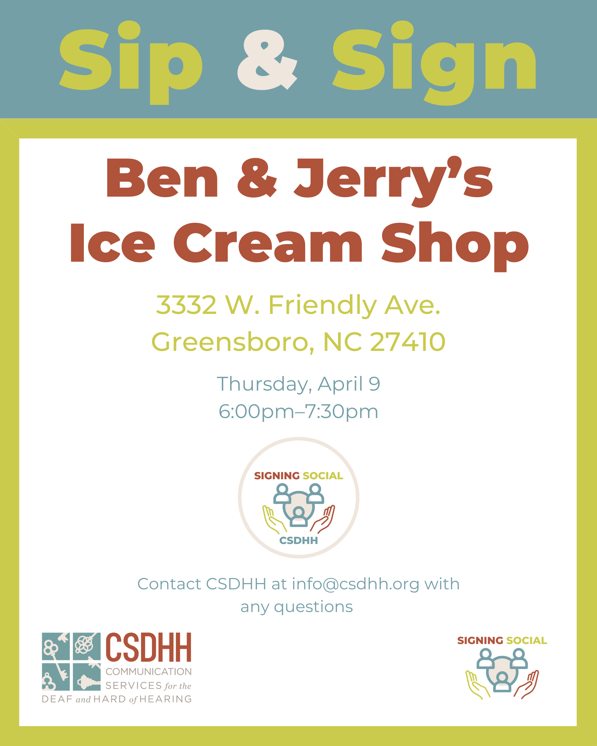 Our April Sip & Sign will be at Ben & Jerry’s Ice Cream Shop in Friendly Center, on April 9 at 6:00pm.