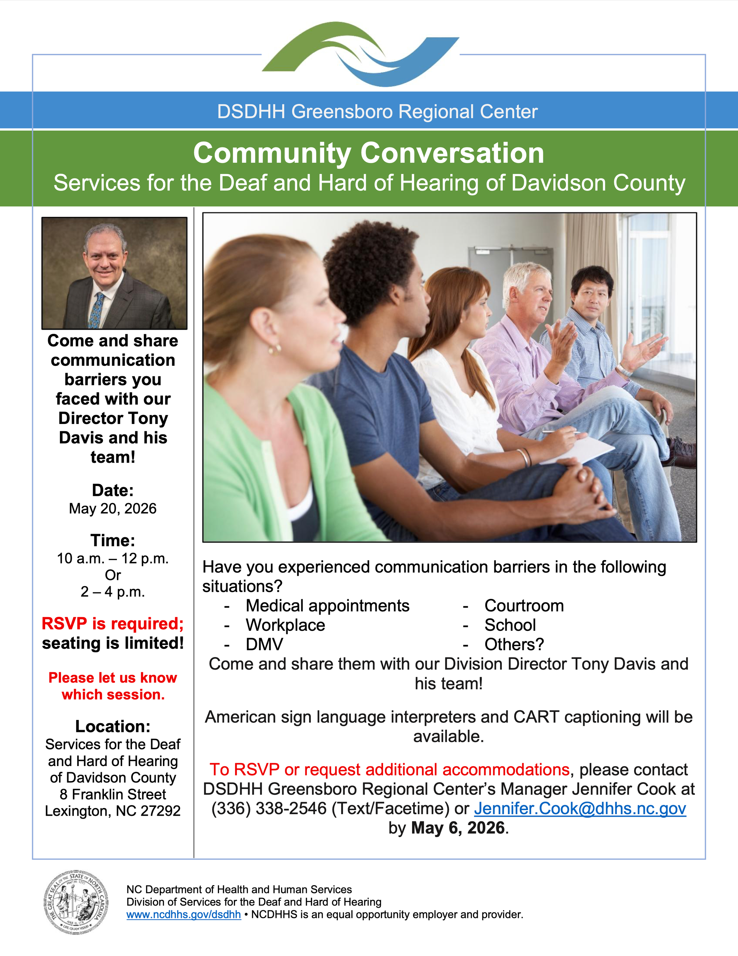 ASL and CART will be available. To RSVP or request additional accommodations, please contact DSDHH Greensboro Regional Center’s manager Jennifer Cook at (336) 338-2546 (text/Facetime) or at Jennifer.Cook@dhhs.nc.gov by May 6, 2026.